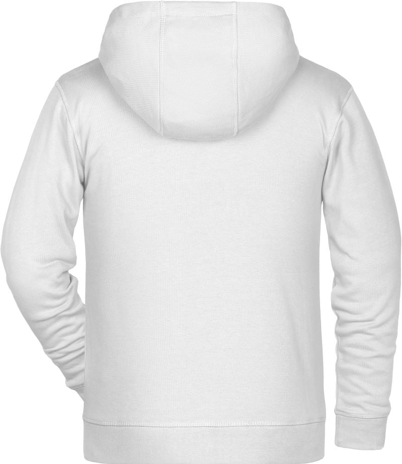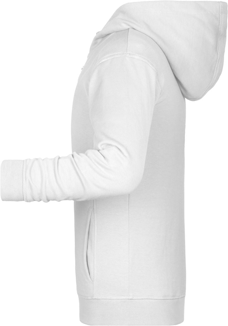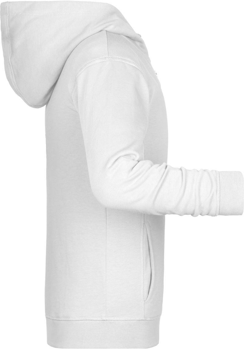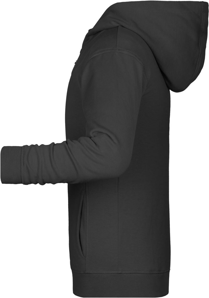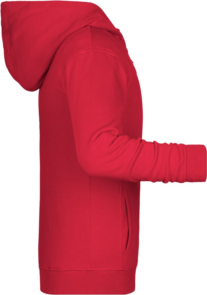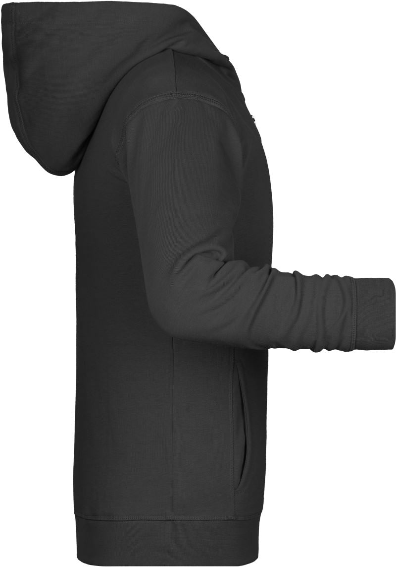 300g/m², 85% gekämmte ringgesponnene zertifizierte Bio-Baumwolle, 15% Polyester, French Terry (innen nicht angeraut)2-lagige Kapuze, Bündchen mit Elasthan, YKK Reißverschluss, Kängurutasche, seitliche Teilungsnähte im Vorderteil, TearAway Label, 30° waschbar, nicht trocknergeeignet